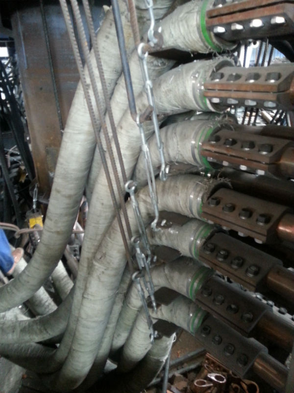 整套水冷線纜使用T2紫銅鍛造,并用超高溫耐火材料包裝,用于工業(yè)電爐強(qiáng)電流供電;具有強(qiáng)導(dǎo)電性和導(dǎo)熱性,使用水冷降溫系統(tǒng),使其可以在超高溫工業(yè)環(huán)境下良好工作。